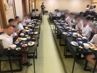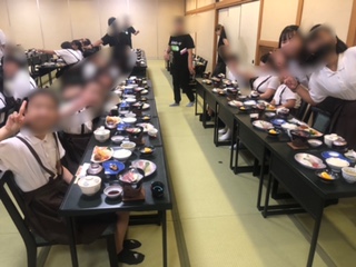大広間に個別のお膳が並べられてあります。いすに座って食べます。