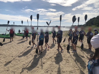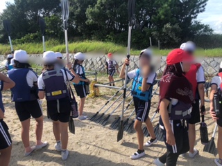 スタッフからパドル(こぐための棒)の説明を受けて、一人一人がパドルを持っていきます。