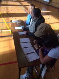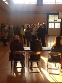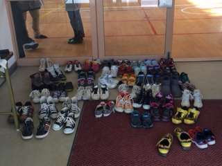今朝は、講堂でPTA親子ドッジビー大会があります。