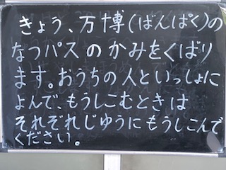 今日、子どもたちに「万博の夏パス」の申し込み用紙を配っています。ご希望される方は記載の「申請の流れ」にそってお申し込みください。