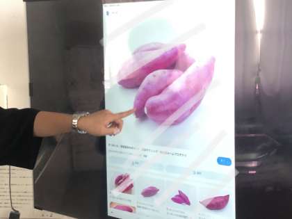 さつまいもを描いていきます。どのように描いていくのでしょうか。写真を見せて説明しています。(さつまいもの映像は加工しています)