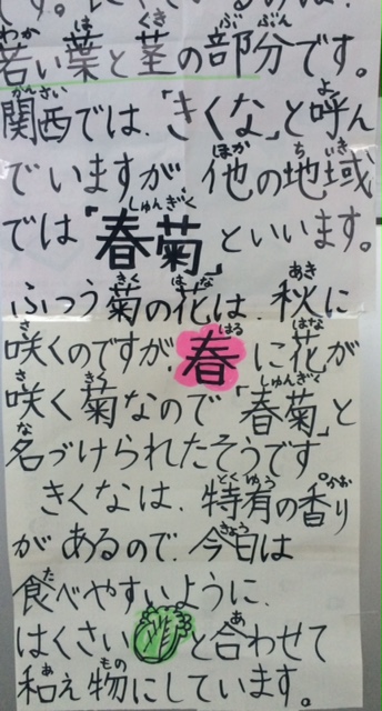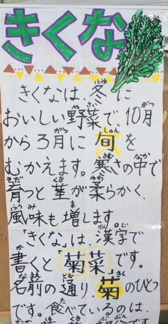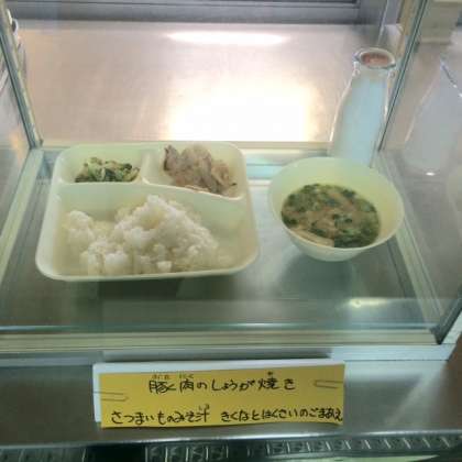 今日の献立は、豚肉の生姜焼、サツマイモの味噌汁、菊菜と白菜の胡麻和え、ごはん、牛乳です。