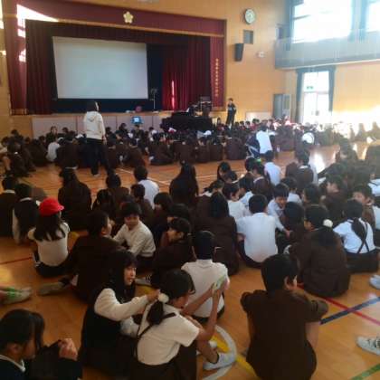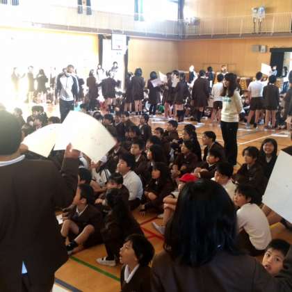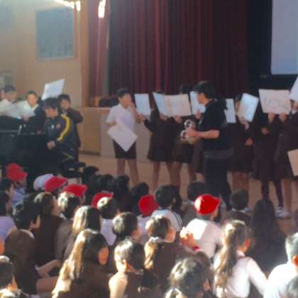 今朝は音楽集会をしています。グループごとに言葉を決めて、言葉のリズムを歌に織り込んで叩きます。