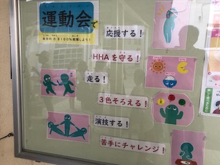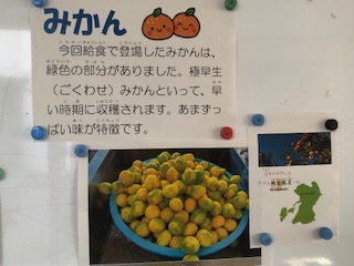 給食室の掲示です。運動会に関して、くだものについて、特に今日でた極早生(ごくわせ)みかんについてくわしく書かれています。