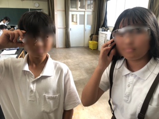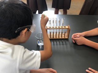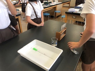 薬品を使った実験をします。今日は薬品を使わずに安全に実験するための説明や用意をしました。安全のため、安全メガネ(ゴーグル)をしています。