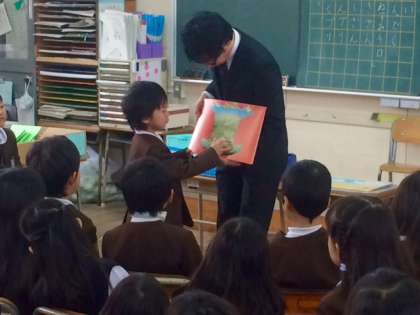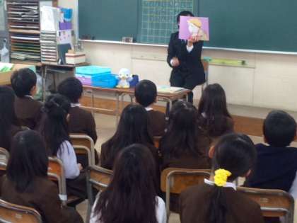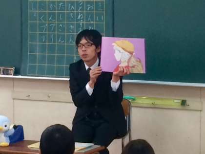 今朝の1年2組は三好先生が読み聞かせをしています。