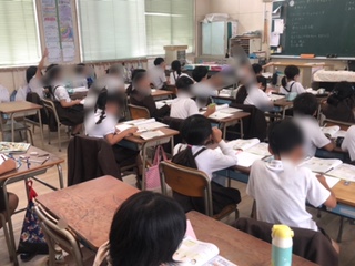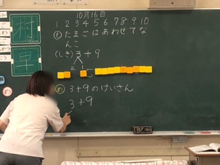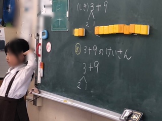 今日は繰り上がり(たして10をこえる)のたし算です。ブロックを使って考えます。前で説明する児童もいます。