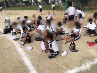 運動会の練習の間に休憩をとり、水分補給をしています。(写真は1年生と3年生です)