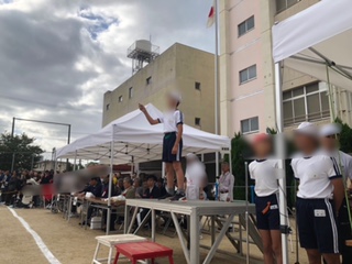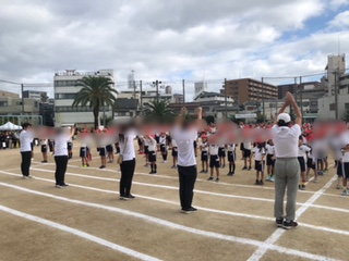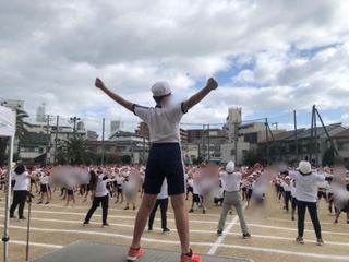 校歌を歌い、ラジオ体操をしました。児童の代表が朝会台から指揮や体操をしました。