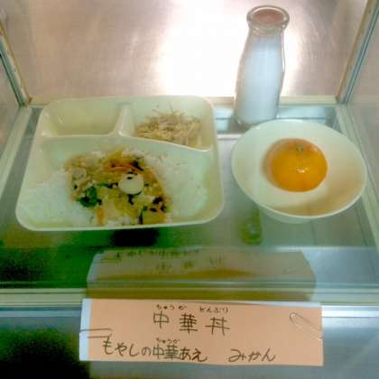 今日の献立は、中華丼、もやしの中華和え、ミカン、牛乳です。