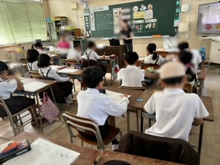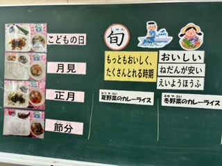 栄養教諭が食に関する授業を進めています(写真は3年生)。季節ごとの献立、旬の食べ物について学んでいます。