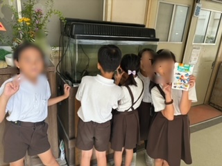昼休みに職員室横の魚に3年生がえさを与えています。
