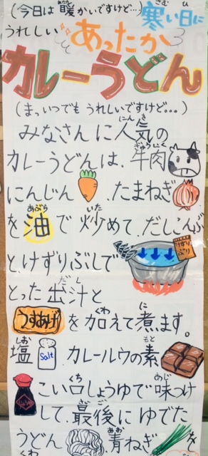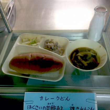 今日の献立は、カレーうどん、白菜の甘酢和え、焼きレンコン、黒糖パン、牛乳です。