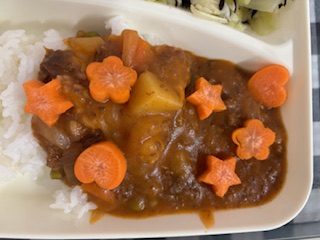 今日のハヤシライスにはラッキーにんじんが入っています。星やハートなどに切ったにんじんが入っていると、ラッキーですね。