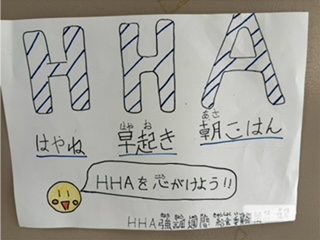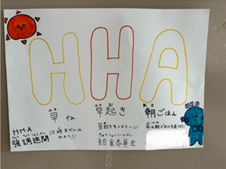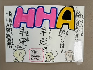 今週は、早ね早おき朝ごはんの強調週間です。給食委員会の子どもたちが作ったポスターがはられています。