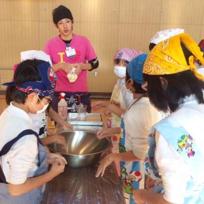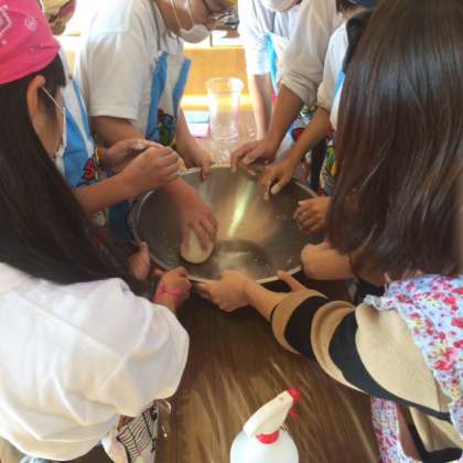 餃子の皮を作っています。柔らかくって気持ち良いと声が聞こえてきます。