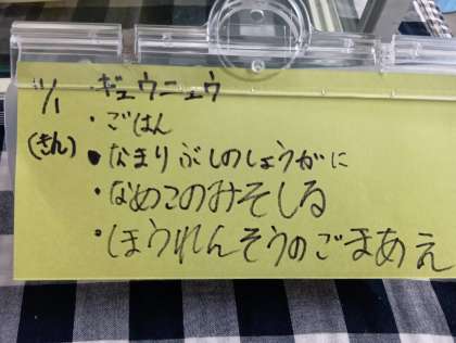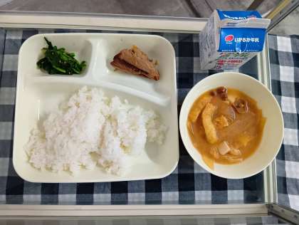 今日の給食には、なめこの味噌汁、なまり節、ほうれん草がでました