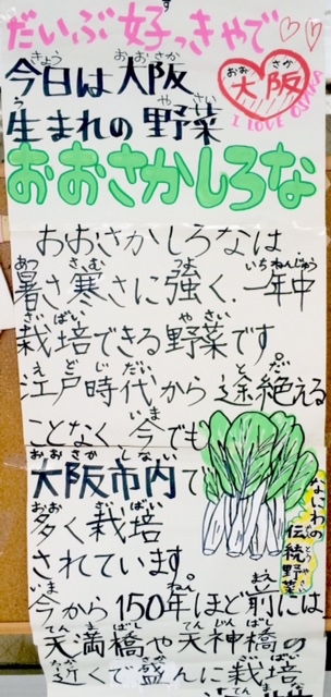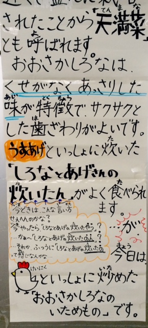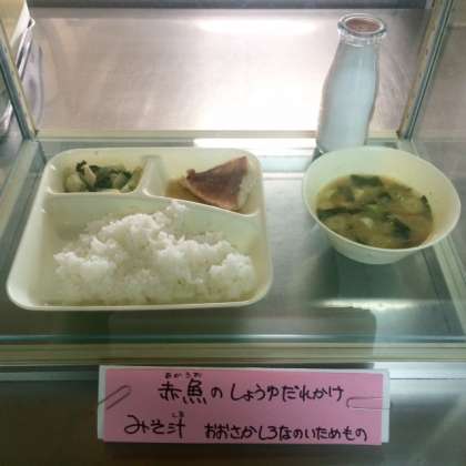 今日の献立は、赤魚の醤油ダレかけ、大阪白菜の炒め物、味噌汁、ごはん、牛乳です。
