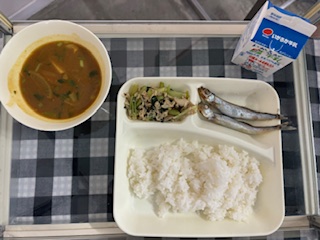 今日の給食には、ししゃもがでました。和風のカレー汁もでました。さといもが入っています。