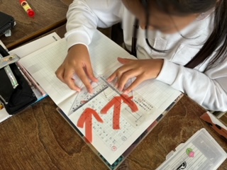 三角定規(矢印)を使って、垂直な線を引いています