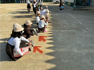 鏡で日光を反射される実験です(矢印が鏡)