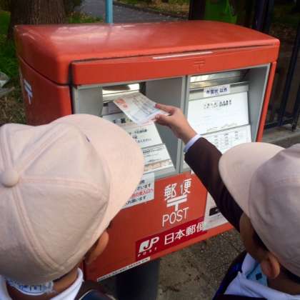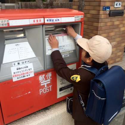 1年生が、下校時の宿題をしています。授業で、年賀状の書き方を学習しました。その年賀状を自分自身でポストに入れることが宿題です。どの子どもたちもポストがはじめての様子です。担任の先生から「赤い文字で年賀状と書いている口に入れます」と教えてもらい、赤い方と年賀状を出しています。