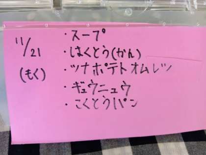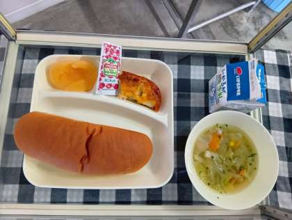 今日の給食は、ツナポテトオムレツでした。ケチャップ、白桃の缶詰もつきました。