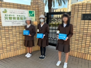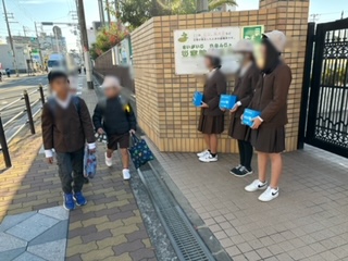 ニセフ募金の箱を手にして、代表委員会の子どもたちが門に立っています