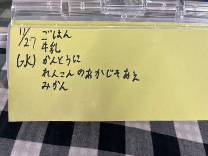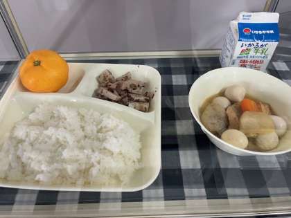 今日の給食は、関東煮、れんこんの赤じそあえ、ごはん、牛乳、みかんです。