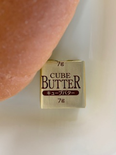 スープの他に、豚肉、うずら豆を使った献立がありました。パンにつけるバターもついていました。