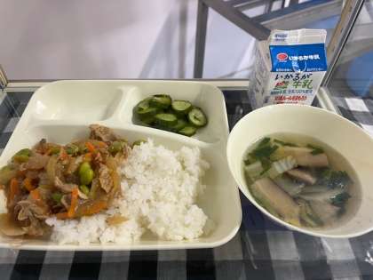 今日の給食は、ピリからどんぶり、中華スープ、きゅうりのあまずづけ、ごはん、牛乳です。