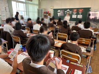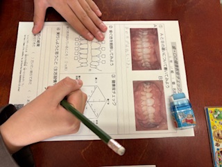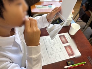歯科衛生士の方にきていただき、歯、口の健康について教えていただきました。自分の歯や口を見たり、チェックしたりして詳しく学んでいきました。