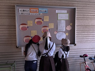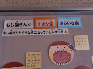 保健室横の掲示板には歯のことについて貼られています。子どもたちが真剣に見ています。歯を大切にしていきましょうね。