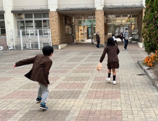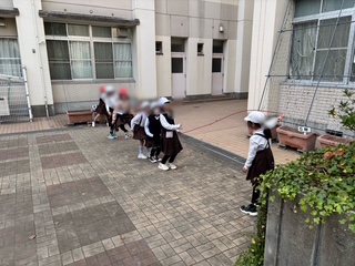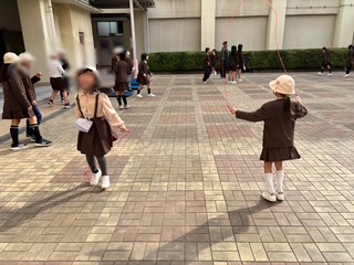 中庭で、一人なわとび、みんなでなわとび、だるまさんがころんだ、で楽しんでいます
