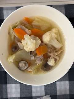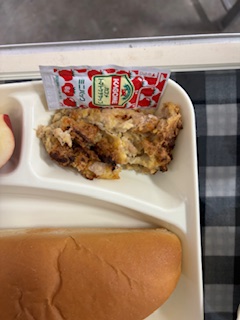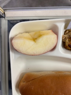 とうふローフ(ケチャップ付き)、りんご、カリフラワーのスープ煮です