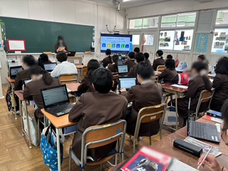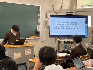 SDGsについて調べたことを発表しています。まとめたことを端末に入れてモニターに映しています。