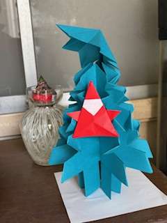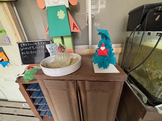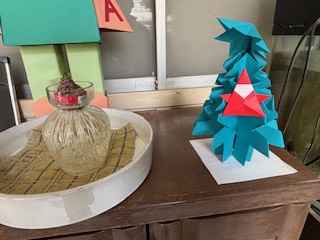 ツリーの飾りを学校司書の方が作られました。校長室前に飾っています。横にあるガラス容器はヒヤシンスの水栽培です。