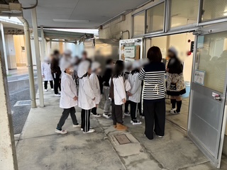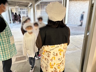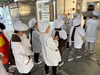 今日は2学期最後の給食です。給食室に給食当番が並んでいます。