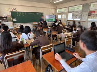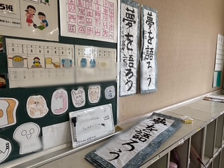 専科の先生と冬休みのことを話しています。後ろの掲示板には書き初めが置かれています。これから順番にはっていくのですね。