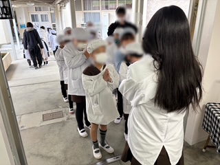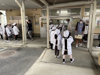 エプロンをつけて給食当番が給食室に取りに行きます。給食委員会の子どもたちが迎えています。(写真下)