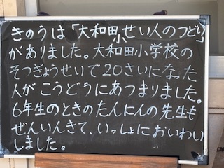 昨日の成人の日には、大和田小学校で「大和田成人の集い」がありました。大和田小学校を卒業した20歳の人が大和田小学校の講堂に集まりました。6年生の時の担任の先生も全員来られて、当時の写真を映したり、話をしたりしながら楽しくお祝いしました。