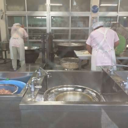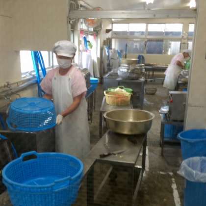 朝から、冷たい中3人の給食調理員のみなさんが、給食作りに励んでいます。