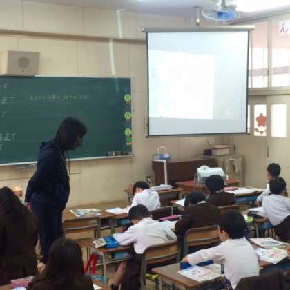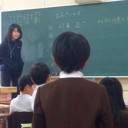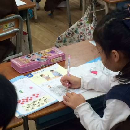 1年生算数の授業です。子どもたちは先生のお話をしっかり聞いて授業に取り組んでいます。
