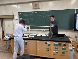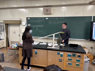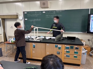 理科室に大きな実験用のてこを置いて、子どもたちがおもりを持ち上げながら、支点・力点・作用点との距離と重さの関係を比べています。
