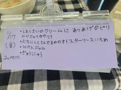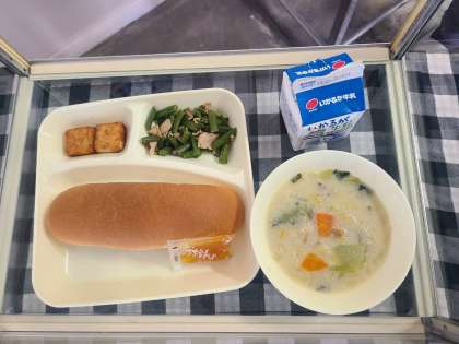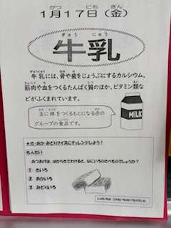 今日の給食は、クリーム煮です。白菜が使われています。給食カレンダーには牛乳の栄養についてのっています。