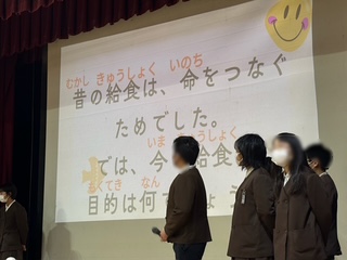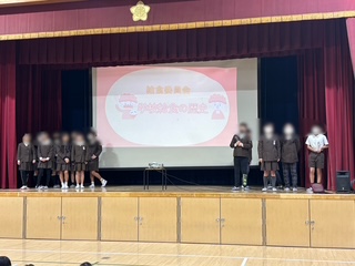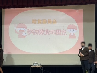 今日の児童集会では給食委員会の子どもたちが学校給食の歴史をクイズ形式で発表しました。