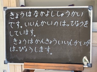 毎週水曜日の朝は、なかよし集会をしています。委員会発表をしています。今日は環境委員会の発表です。