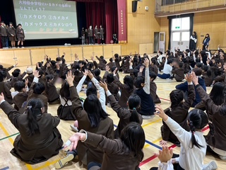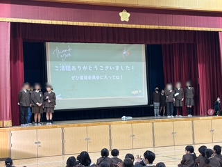 環境委員会はクイズの形で活動を発表しました。正解と思うところで手を挙げています。