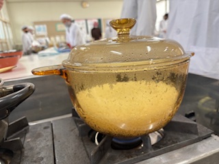 ごはんが炊けてきています。透明な鍋なので炊けている様子がよくわかります。