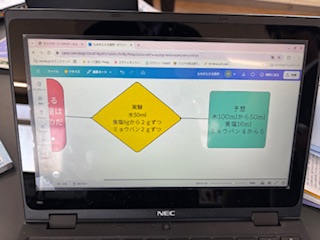 溶け方についての学習です。きちんと計ってどれだけ溶けるのかを調べています。手順を考えてフローチャートにまとめています。